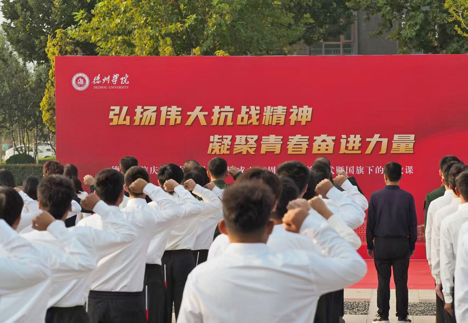 爱国是深植血脉的精神基因,奋斗是青春最亮丽的底色,担当是时代赋予青年的历史责任。五星红旗下,思想洗礼,信仰生根。师生共同学习《习近平:在纪念中国人民抗日战争暨世界反法西斯战争胜利80周年大会上的讲话》,学生代表深情朗诵《我的青春》,全体学生以掷地有声的“青春宣誓”明志,《我和我的祖国》歌声在校园上空回响……这一幕幕生动展现了新时代青年的责任担当,深刻诠释了伟大抗战精神的时代传承,指引广大学生以民族复兴为己任,立报国强国大志向,做挺膺担当奋斗者。2025级硕士研究生葛承宝深有感触地说,“当五星红旗冉冉升起,国旗下的思政课字字叩击心门。身为学生党员,我深知责任与使命,愿以青春热血传承信仰,书写对党和祖国的忠诚答卷。”
