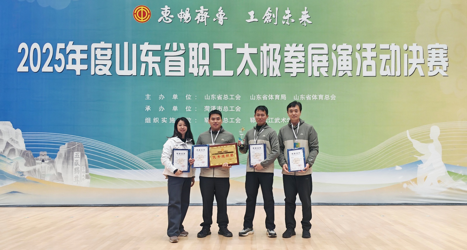 为深入贯彻全民健身国家战略,弘扬中华优秀传统文化,10月21日至22日,由山东省总工会、山东省体育局、山东省体育总会联合主办的“惠畅齐鲁 工创未来”2025年度山东省职工太极拳展演活动,在郓城会盟武术交流中心隆重举行。我校体育学院韩英甲、王亚男、戎杰、周瀚轩四位教师受邀代表德州市总工会参赛。