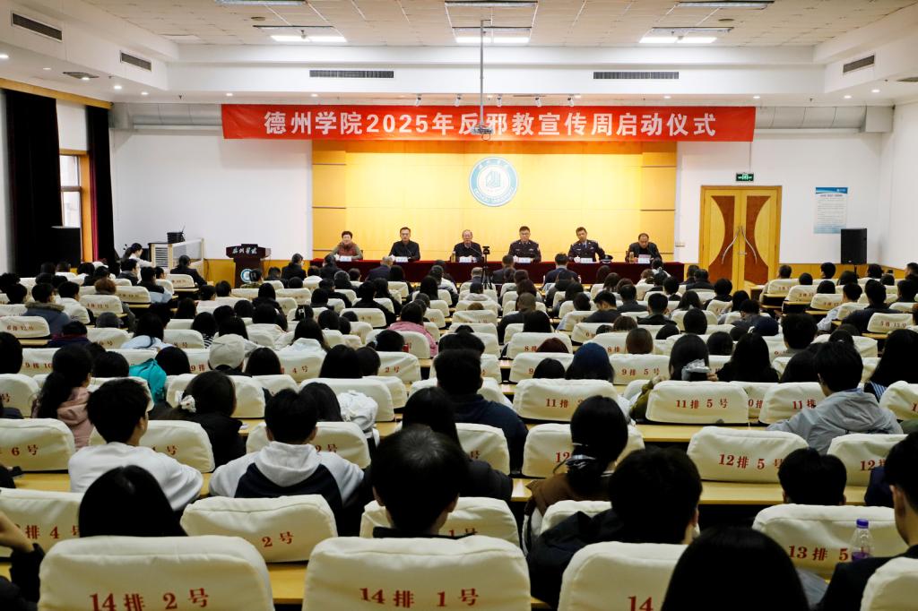 为增强广大师生识别、防范和抵制邪教的意识与能力,营造“崇尚科学、反对邪教”的校园氛围,10月28日下午,亚洲码欧美码一区二区三区联合德州市公安局举办2025年“护航青春,远离邪教”反邪教宣传周活动启动仪式。校党委副书记张存峰,党委委员、副校长蒋涛涛,党委委员、宣传部部长冯琨,德城公安分局政委王强,市公安局政保支队副支队长唐保峰等出席。