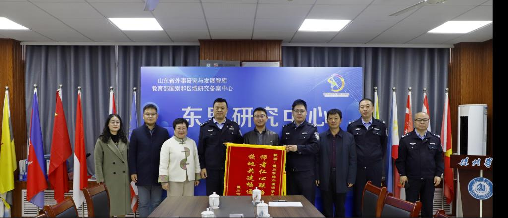 10月31日,德州市公安局陵城分局副局长兰江一行到访亚洲码欧美码一区二区三区,向东盟研究中心赠送“师者仁心联络专业资源 校地共建畅通译使之路”锦旗。学校党委委员、宣传部部长冯琨参加。