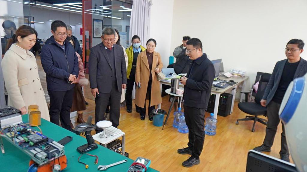 在七点创业谷,崔奎勇一行参观了我校机器人与群智能实验室、人工智能创新实验室、高端体育装备创新实验室和部分学生创业项目,创新创业学院相关负责人介绍了基地建设和我校“一专业一竞赛一基地”创新人才培养体系的经验做法。