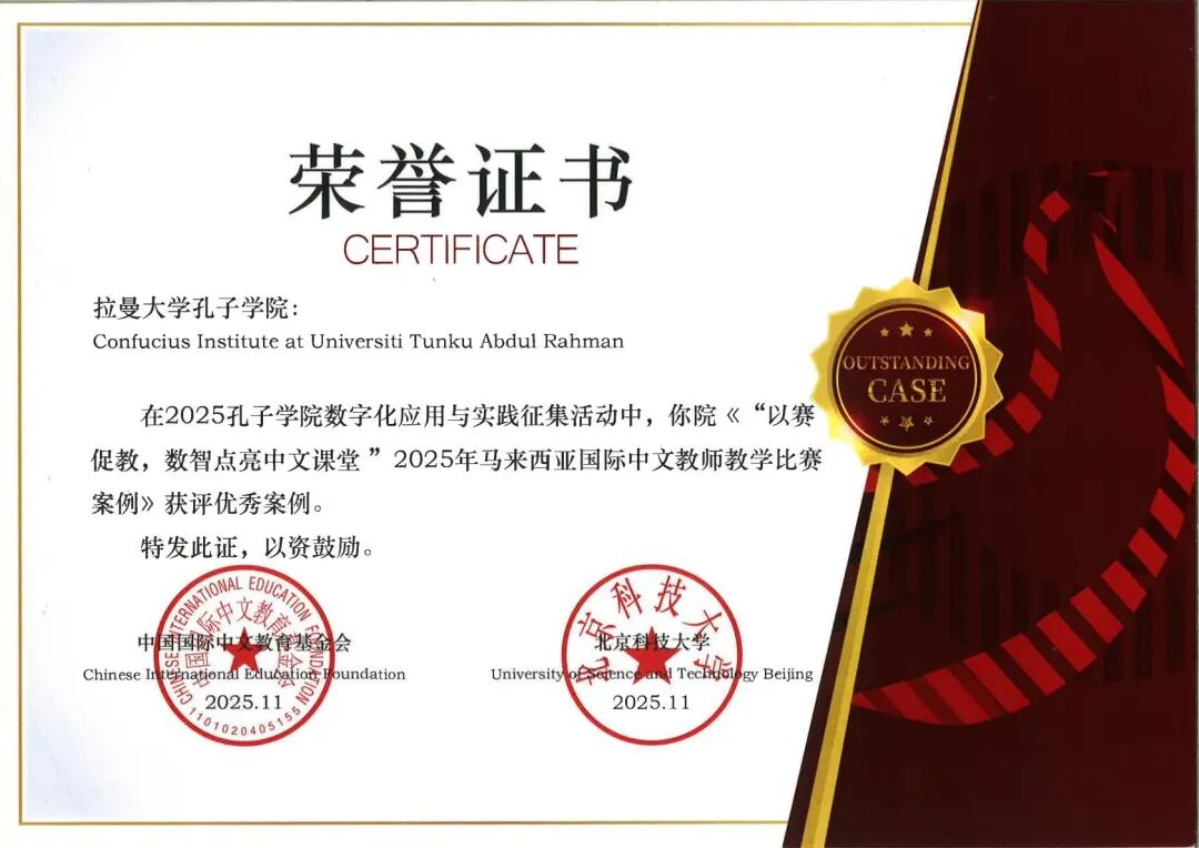 本届大会以“创新引领 数智赋能—让中文零距离”为主题, 吸引了全球数百项案例参与角逐。经严格评审,最终遴选出20项“示范案例”及“优秀案例”。拉曼大学孔子学院两项案例的成功入选,彰显了其在中马教育合作与数字化中文教育领域的领先地位。