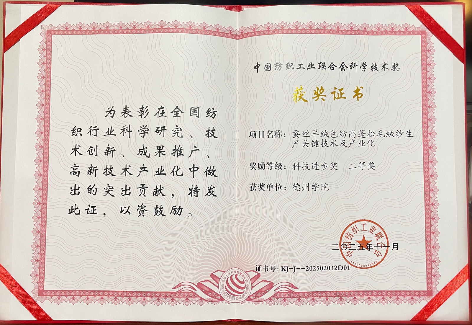 该获奖项目面向纺织行业高质量发展的重大需求,在蚕丝羊绒色纺高蓬松毛绒纱生产的关键技术上取得了重要突破,实现了科技成果的成功转化与产业化应用,对推动相关产业的技术升级和绿色发展具有重要意义。此项成果的取得,充分展现了我校科研团队在纺织科技领域的深厚积累与创新能力,是学校持续推进产学研合作、服务产业升级的又一重要体现。