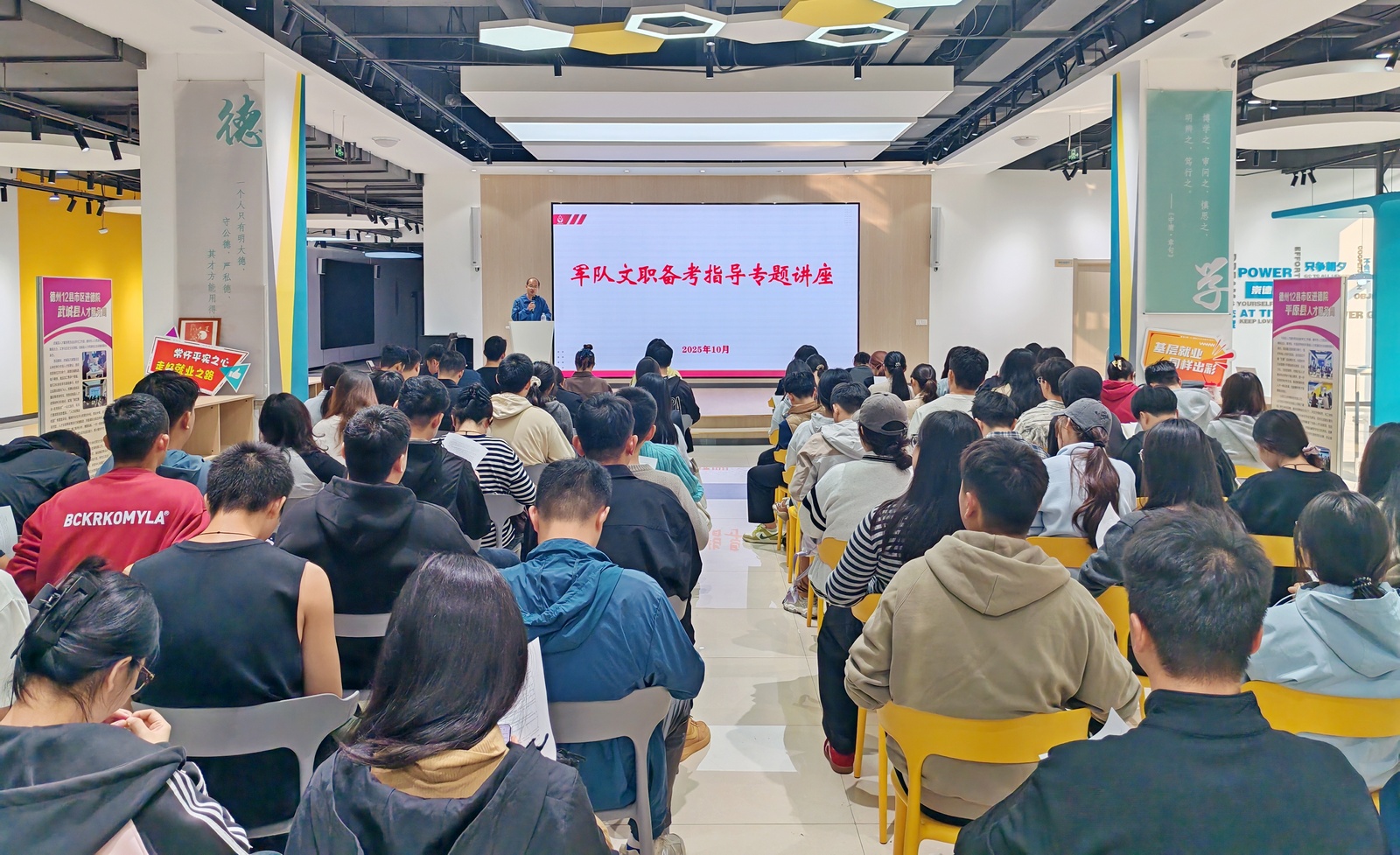 为帮助同学们拓宽就业视野,精准把握军队文职招考政策,深入了解军队文职职业发展前景,科学规划职业生涯,10月15日,学校举办军队文职备考辅导讲座,助力我校学子圆梦“孔雀蓝”。