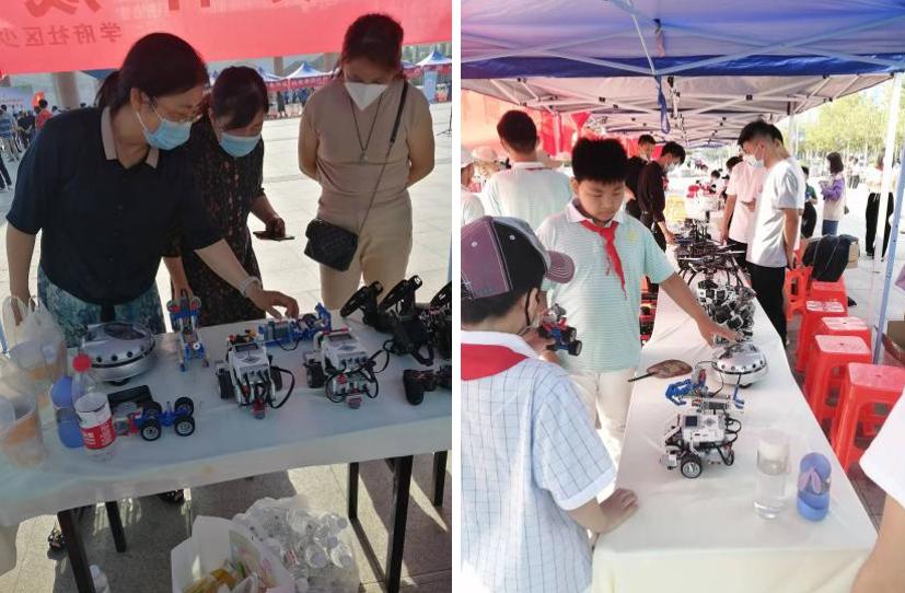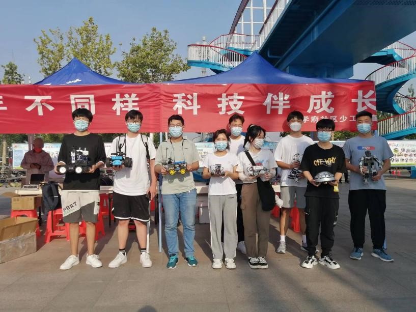 活动现场,创新创业学院组织实验管理中心、计算机与信息学院、物理与电子信息学院等教学单位的学生人工智能与机器人项目进行了社区实践展示。其中,自主开发的助老服务机器人、深度学习智能车、仿生六足蜘蛛机器人等人工智能产品吸引了众多少先队员和师生的兴趣和关注。
