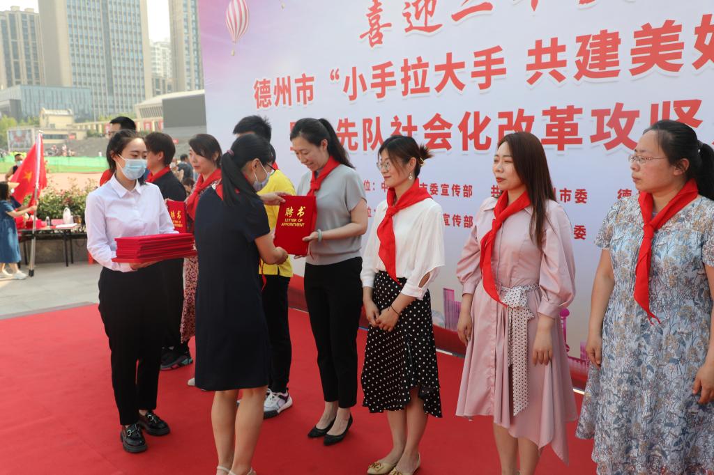 6月3日上午,在德州市“小手拉大手 共建美好家园”活动现场推进会暨少先队社会化改革攻坚“六个一”行动启动仪式上,共青团德州市委书记张方瑞为我校13个学院团总支书记颁发校外辅导员聘书。市委副书记、市少工委名誉主任苑衍刚出席并致辞,市领导张泽中、才玉璞出席。