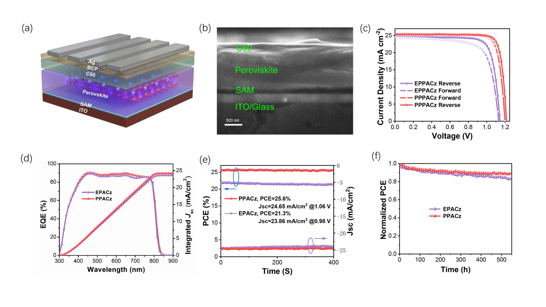 基于PPACz的器件表现出高达26.1%的光电转换效率(相比EPACz的22.0%提升显著),在1 cm²大面积电池中也实现了23.5%的效率。同时未封装的器件在连续光照下工作540小时后仍能保持90%以上的初始效率,展示出优异的稳定性。该成果的发表为新型SAMs材料的设计提供了良好的借鉴。