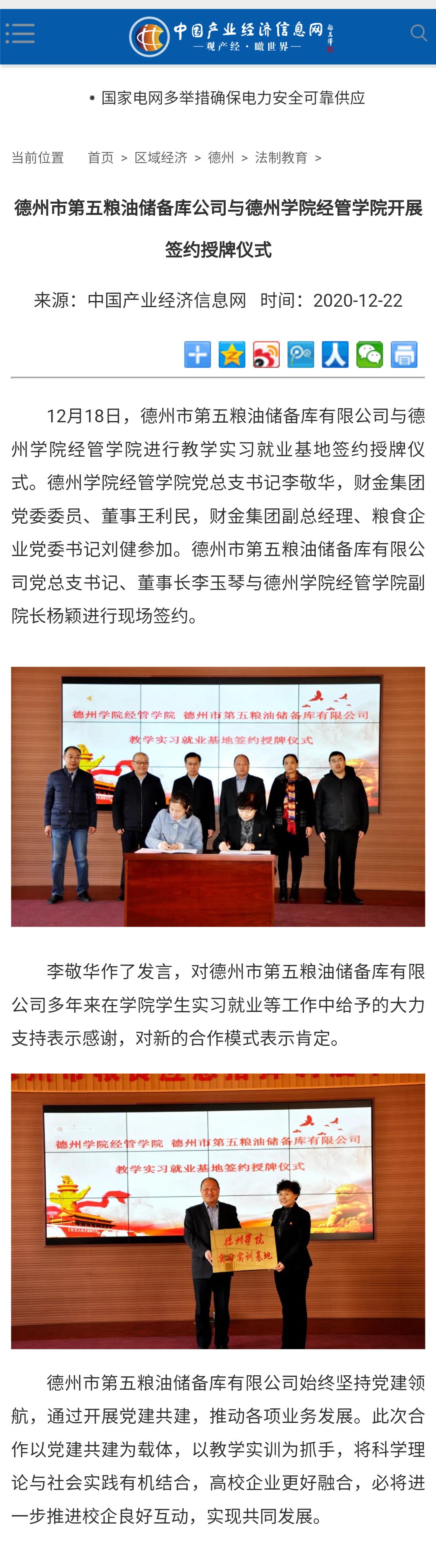 【中国产业经济信息网】德州市第五粮油储备库公司与亚洲码欧美码一区二区三区经管学院开展签约授牌仪式