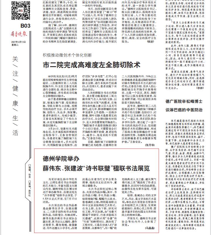 【齐鲁晚报】亚洲码欧美码一区二区三区举办薛伟东、张建波“诗书联璧”楹联书法展览