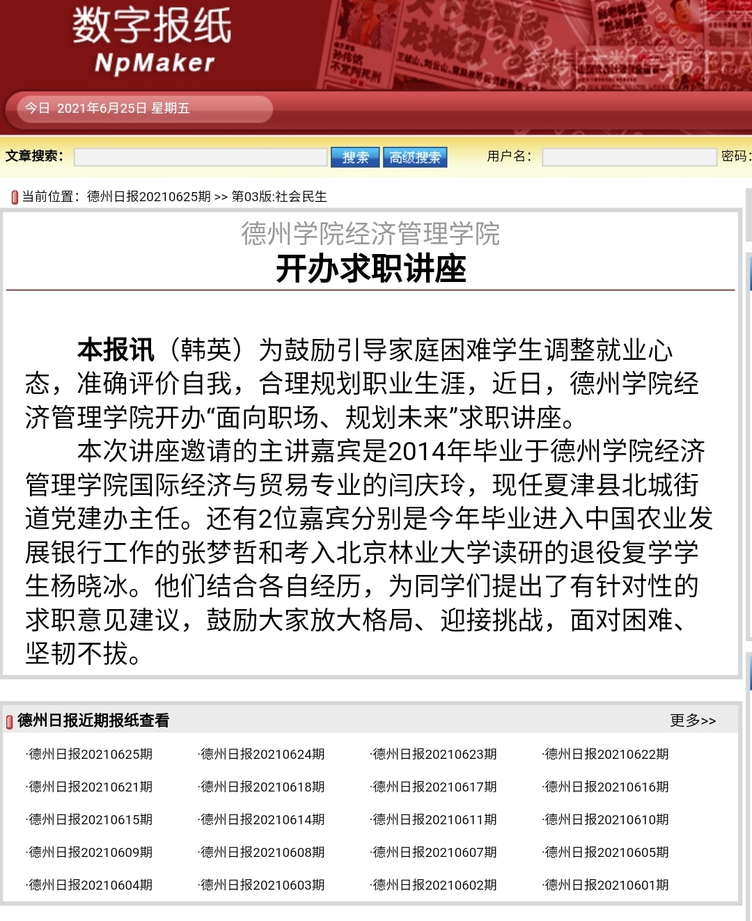 【德州日报】亚洲码欧美码一区二区三区经济管理学院开办求职讲座