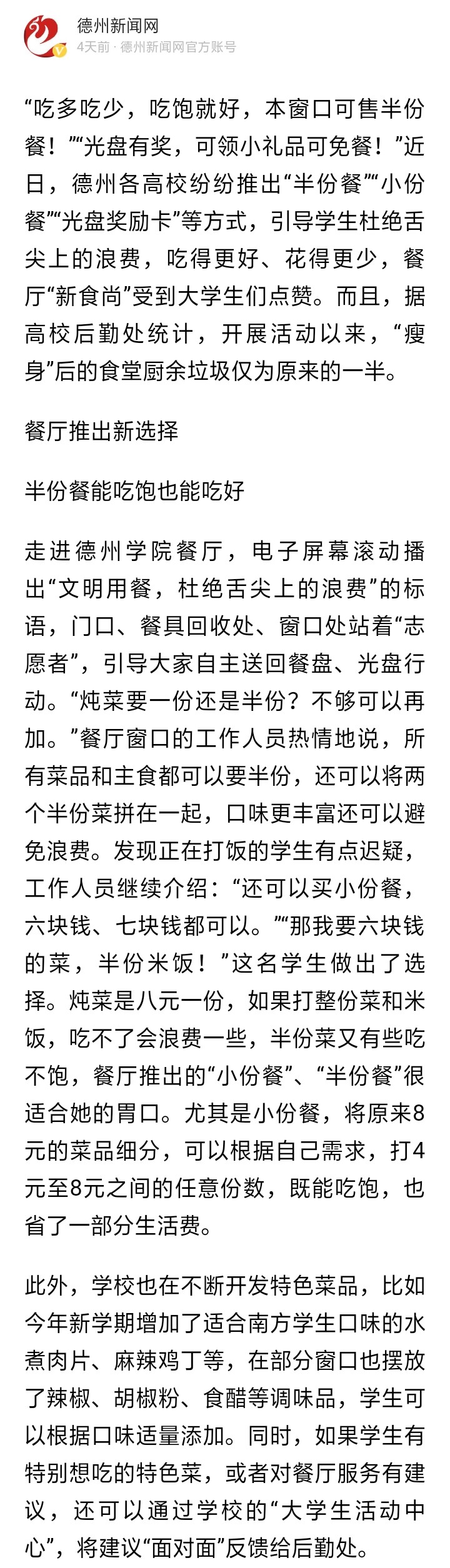 “吃多吃少,吃饱就好,本窗口可售半份餐!”“光盘有奖,可领小礼品可免餐!”近日,德州各高校纷纷推出“半份餐”“小份餐”“光盘奖励卡”等方式,引导学生杜绝舌尖上的浪费,吃得更好、花得更少,餐厅“新食尚”受到大学生们点赞。而且,据高校后勤处统计,开展活动以来,“瘦身”后的食堂厨余垃圾仅为原来的一半。