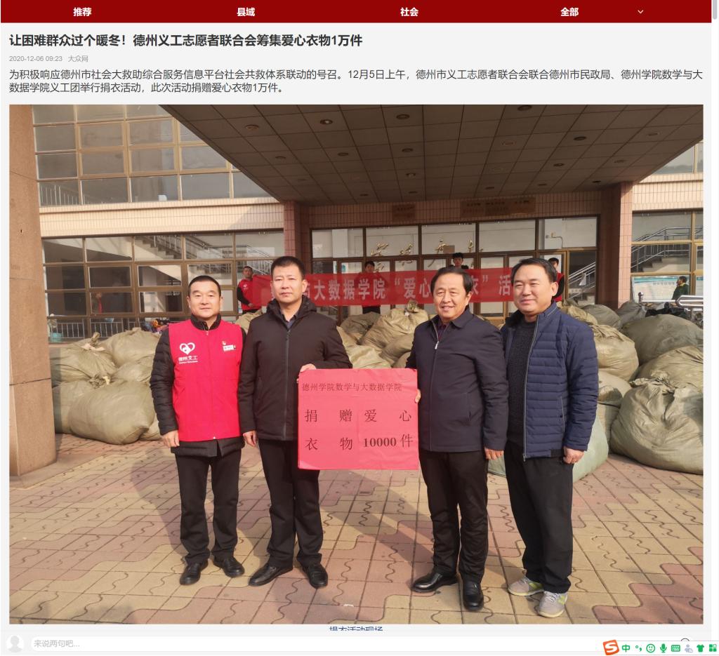 为积极响应德州市社会大救助综合服务信息平台社会共救体系联动的号召。12月5日上午,德州市义工志愿者联合会联合德州市民政局、亚洲码欧美码一区二区三区数学与大数据学院义工团举行捐衣活动,此次活动捐赠爱心衣物1万件。